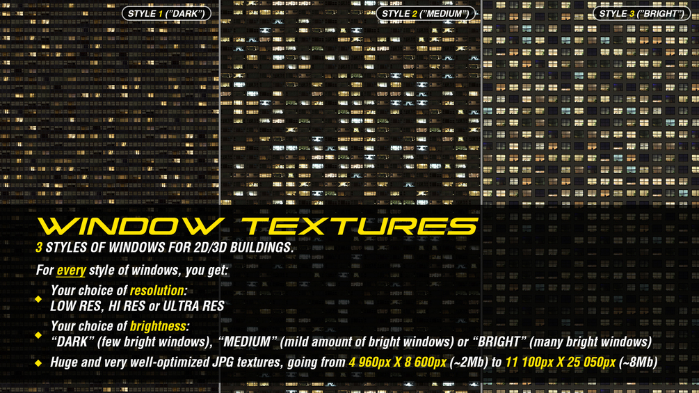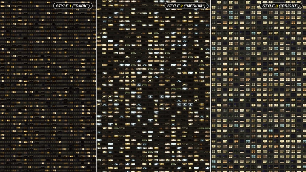 - Your choice of brightness: "DARK" (few bright windows), "MEDIUM" (mild amount of bright windows) or "BRIGHT" (many bright windows)